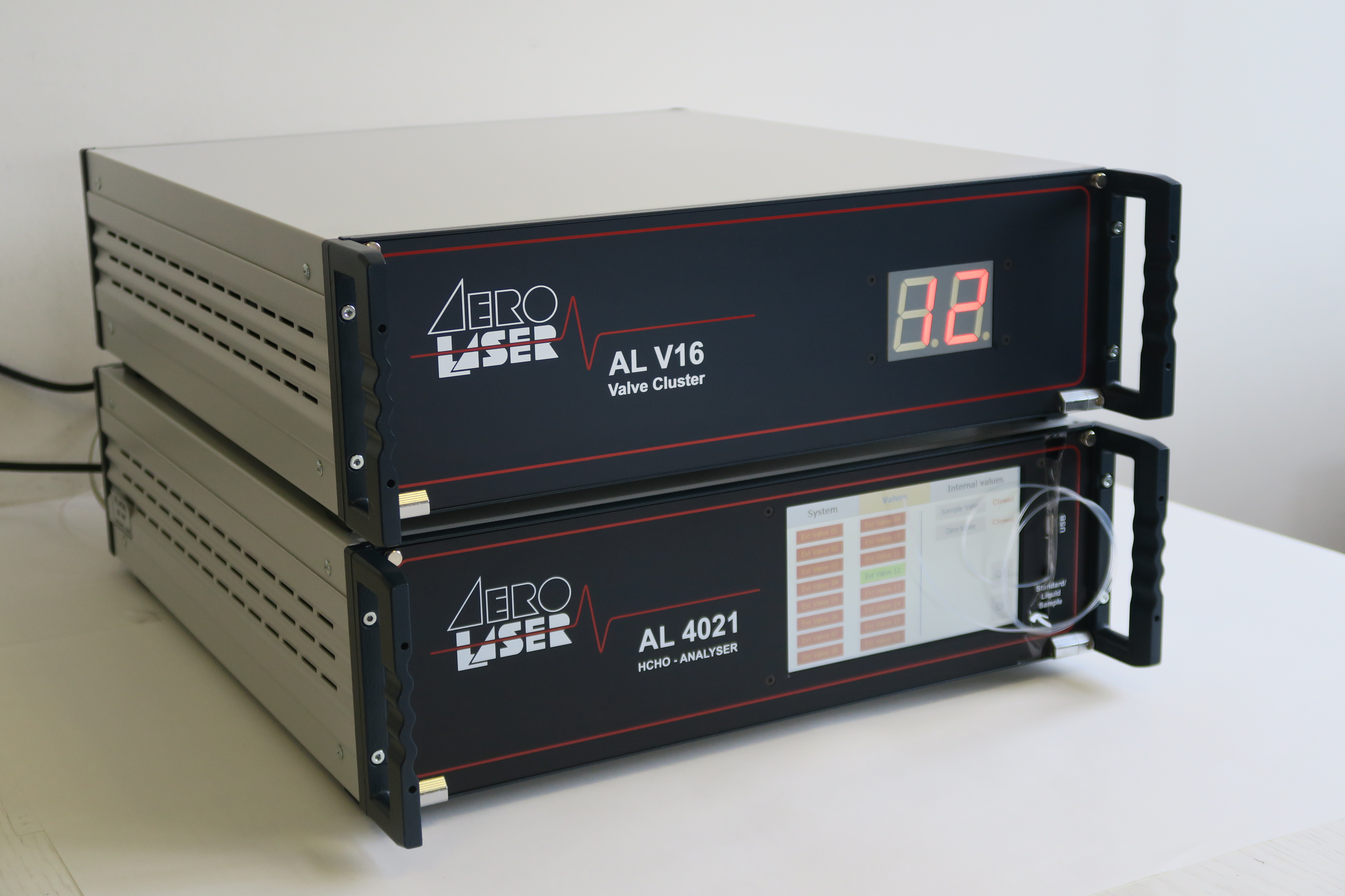 The Aero-Laser instruments AL4021 and AL2021 can be connected by a valve cluster to several gas sources, like test chambers, gas sample flasks or the Micro-Chamber µCTE. There are three versions available with 8, 12 or 16 input ports. This allows automated measurements according to industrial standards, e.g. for formaldehyde: EN 717-1 or ASTM 6007. Each chamber is connected to the rear panel of the valve cluster by a PFA line. If measurements at elevated temperatures are planned, heated hose coupling should be used to prevent condensation of moisture inside the lines.