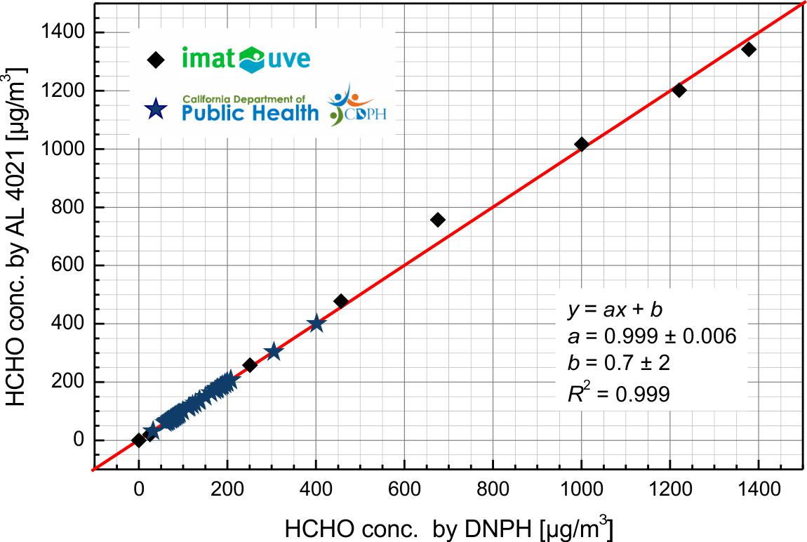 The AL4021 was tested indipendently by two institutions for correllation to the DNPH method. The plot below shows data for a huge range of concentrations from below 50 μg/m3 to ~ 1.4 mg/m3. The data was produced by IMAT/UVE and the California Department of Public Health.