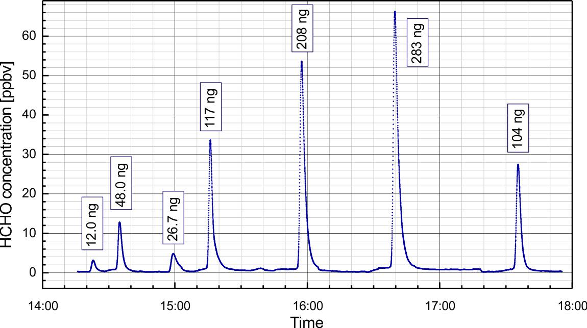 In many cases the total content of formaldehyde in a sample is of interest. This can be determined by evaporation of formaldehyde at elevated temperatures either in a small oven (like the Micro-Chamber µCTE) or by thermal desorption. In the plot vs. time this shows up as peak with an exponential decay flank. The total content of HCHO is calculated by integration over the peak an calculation the content regarding the gas flow and other physical parameters. The figure below shows several HCHO peaks after thermal desorption of MDF samples at 120°C using a Markes Thermal Desorber.